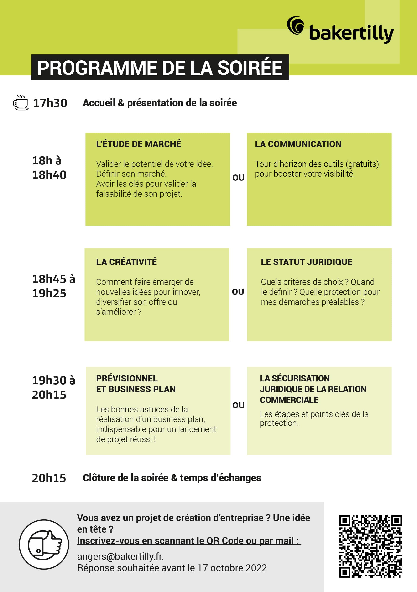 Pour vous guider et vous accompagner dans votre projet, le bureau Baker Tilly Angers organise une soirée d’ateliers et d’échanges, ouverte à tous ► jeudi 20 octobre, de 17h30 à 20h30.
